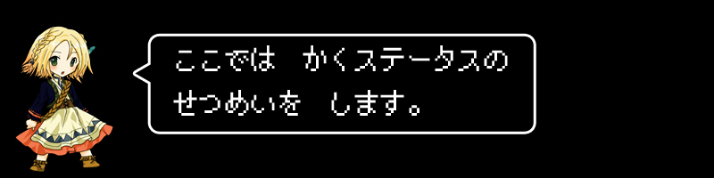 レベルがあがると、手に入ったボーナスを利用し ステータスを自由に振り分けることができます。 各ステータスの効果は以下のものです。