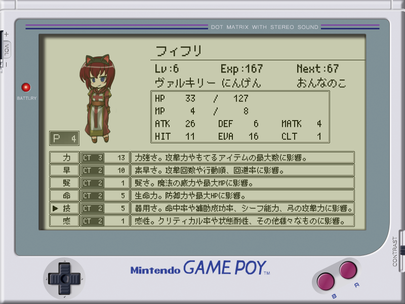 これは魔法による修正値のみではなく、 職業ごとのボーナスや、装備品による上昇値も含めます。 うまく10の位が上がるように育てていくと冒険が楽になるでしょう。