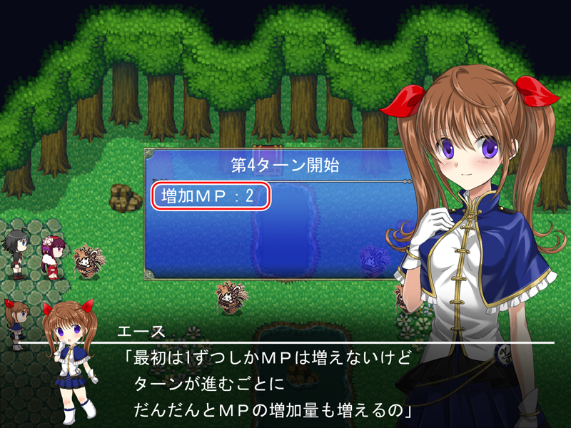 大きくわけて上の4つとなります。 ![]() 毎ターン、MPが入ります。 バトル序盤では少量のMPしか手に入りませんが だんだんと手に入る量が増えていきます。 つまり序盤は消費MPの少ないもので凌ぎつつ、 だんだんと強い仲間や大技が使えるということです。 |